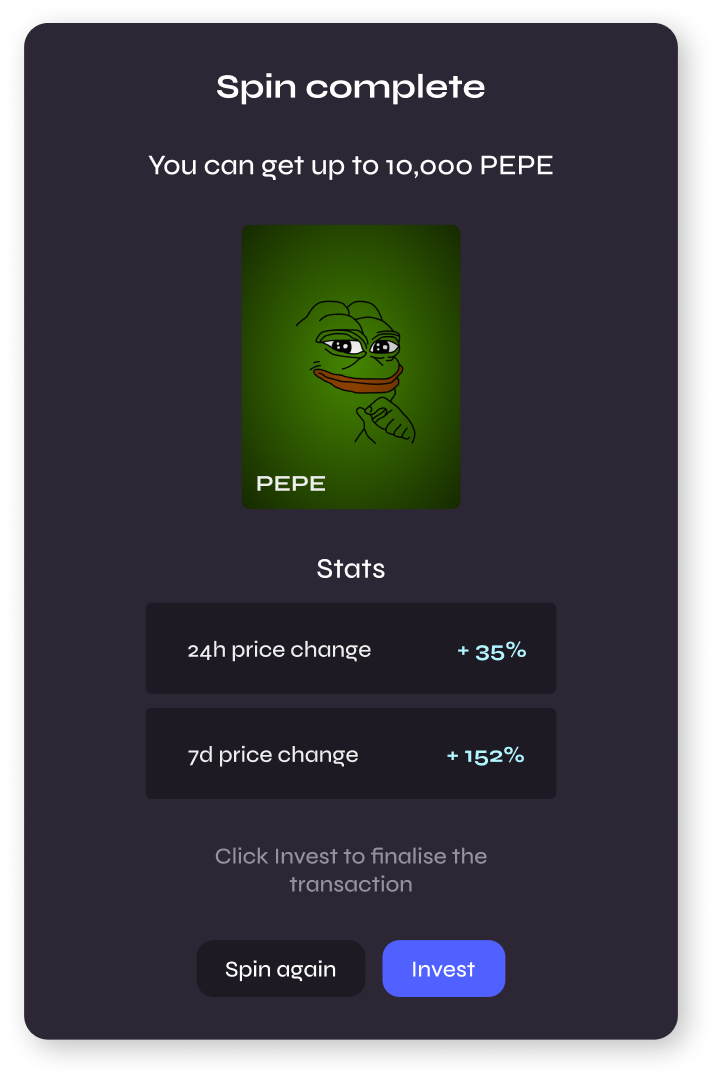 Solspin streamlines investing with just three steps: connect your wallet, make a spin to discover opportunities, and invest (or spin again). Easily monitor your positions and sell anytime